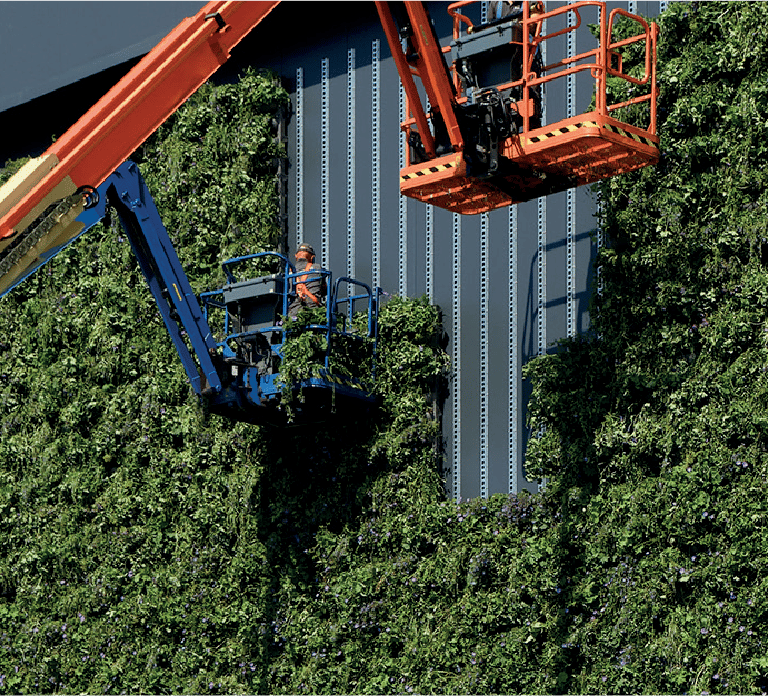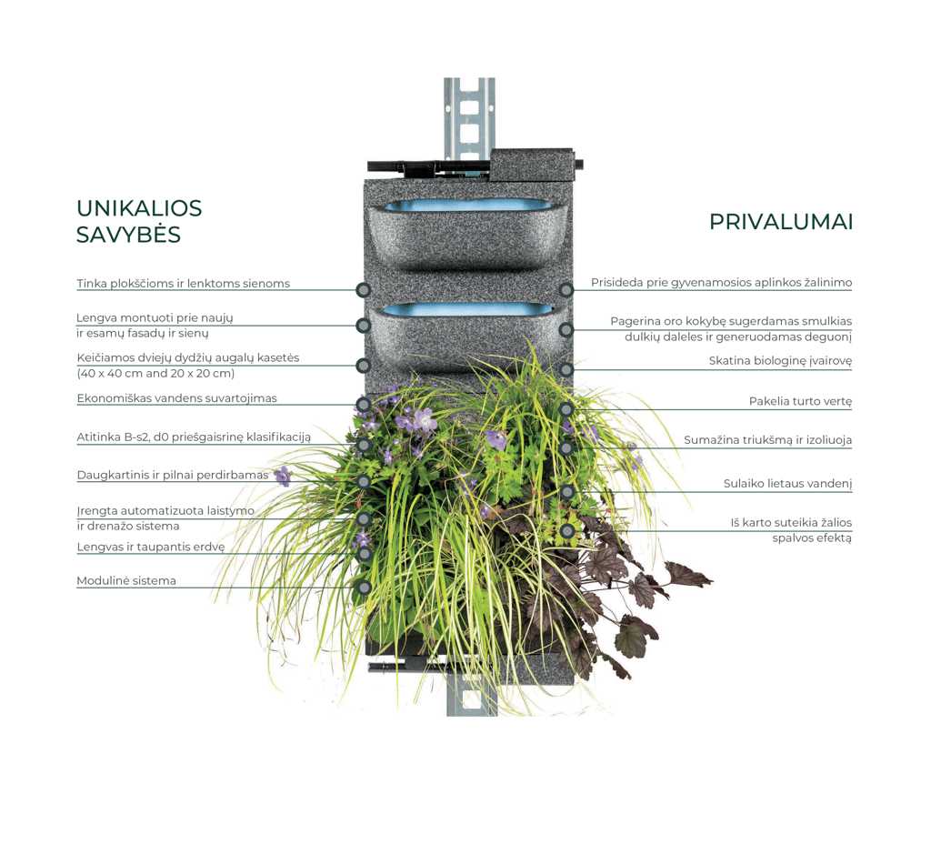 Su vertikalaus želdinimo moduline sistema tikrai lengva sukurti vertikalią, ryškią žalumą. Želdinių sienos skatina biologinę įvairovę, tuo pačiu valo orą ir reguliuoja šilumą. Automatinė laistymo sistema užtikrina, kad augalai gaus reikiamą kiekį vandens ir mitybos ištisus metus. Žalioji siena – tarsi magnetas, traukiantis žvilgsnį miesto aplinkoje, biuruose, automobilių stovėjimo aikštelėse, aptarnavimo sektoriuje ir kt.