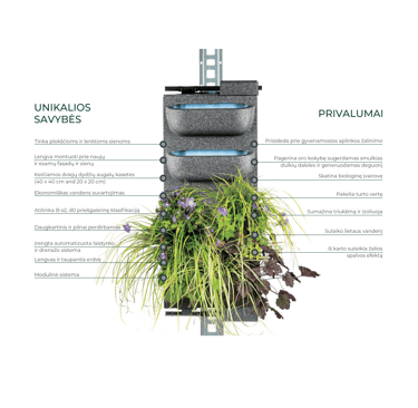 Vertikalaus želdinimo modulinė sistema - novatoriška ir tvari modulinė sistema, skirta gyvenamosioms sienoms ant esamų pastatų konstrukcijų. Sukurta siekiant, kad ateities tvarios statybos būtų dar labiau patrauklios ir prieinamos kiekvienam.