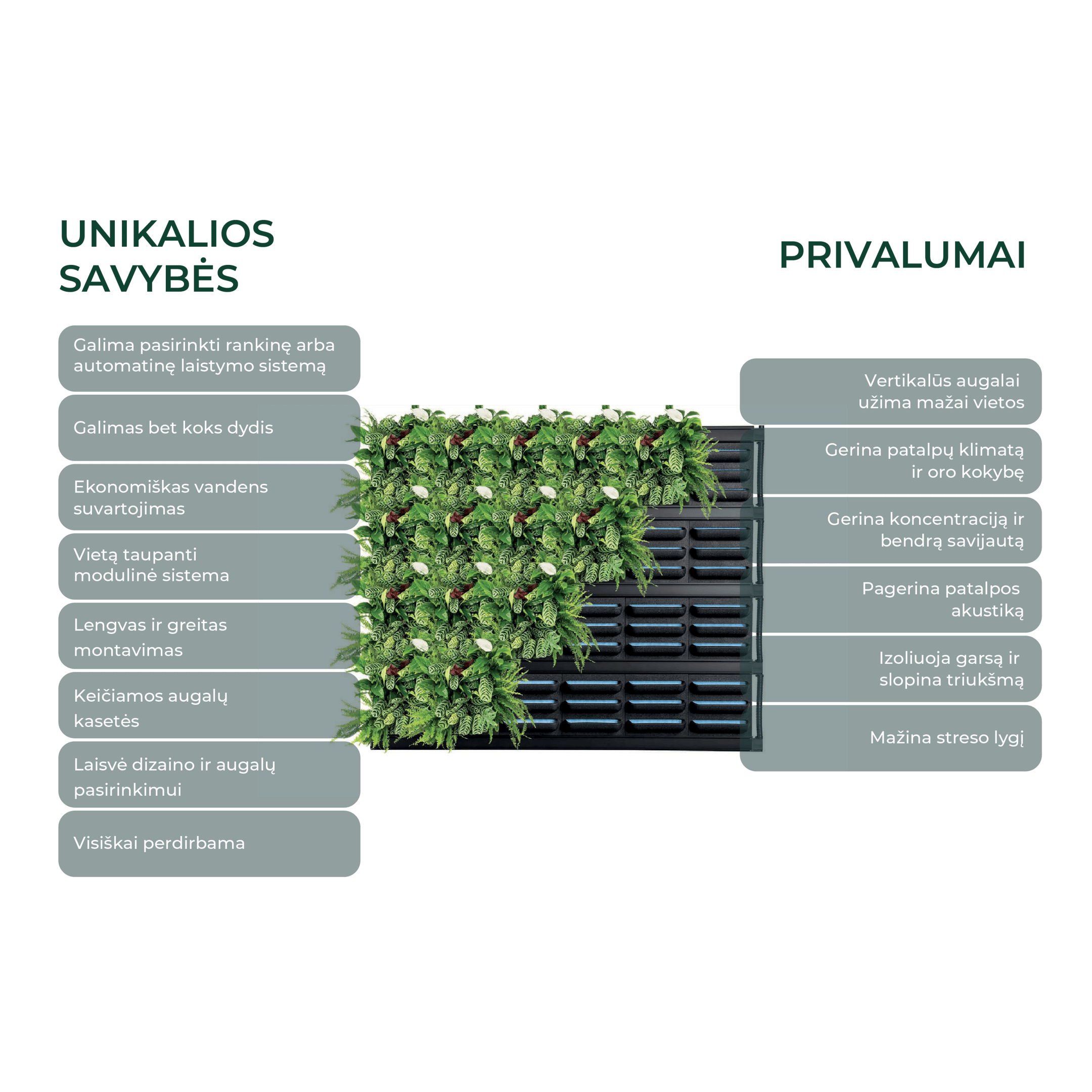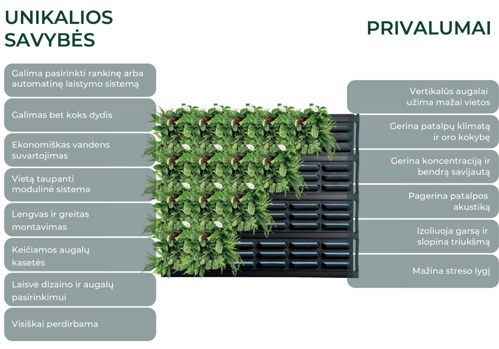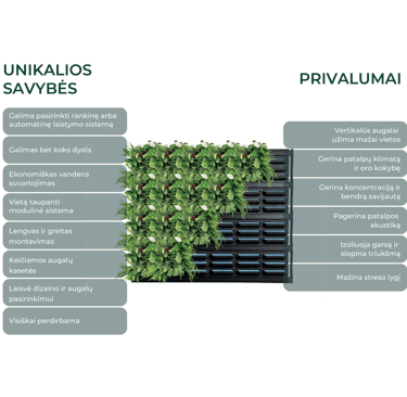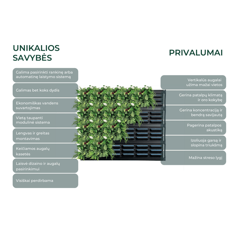 Specializuota vertikalių augalų auginimo sistema, leidžianti kurti žaliuosius sienų sodus tiek namuose, tiek biuruose. Kiekvienas modulis sujungiamas į vientisą struktūrą, kurią galima lengvai pritaikyti pagal individualius poreikius. Dėl šios sistemos, augalai gali vystytis net ir ribotose erdvėse, o jos estetiška išvaizda suteikia unikalumo ir natūralumo bet kokiam interjerui.